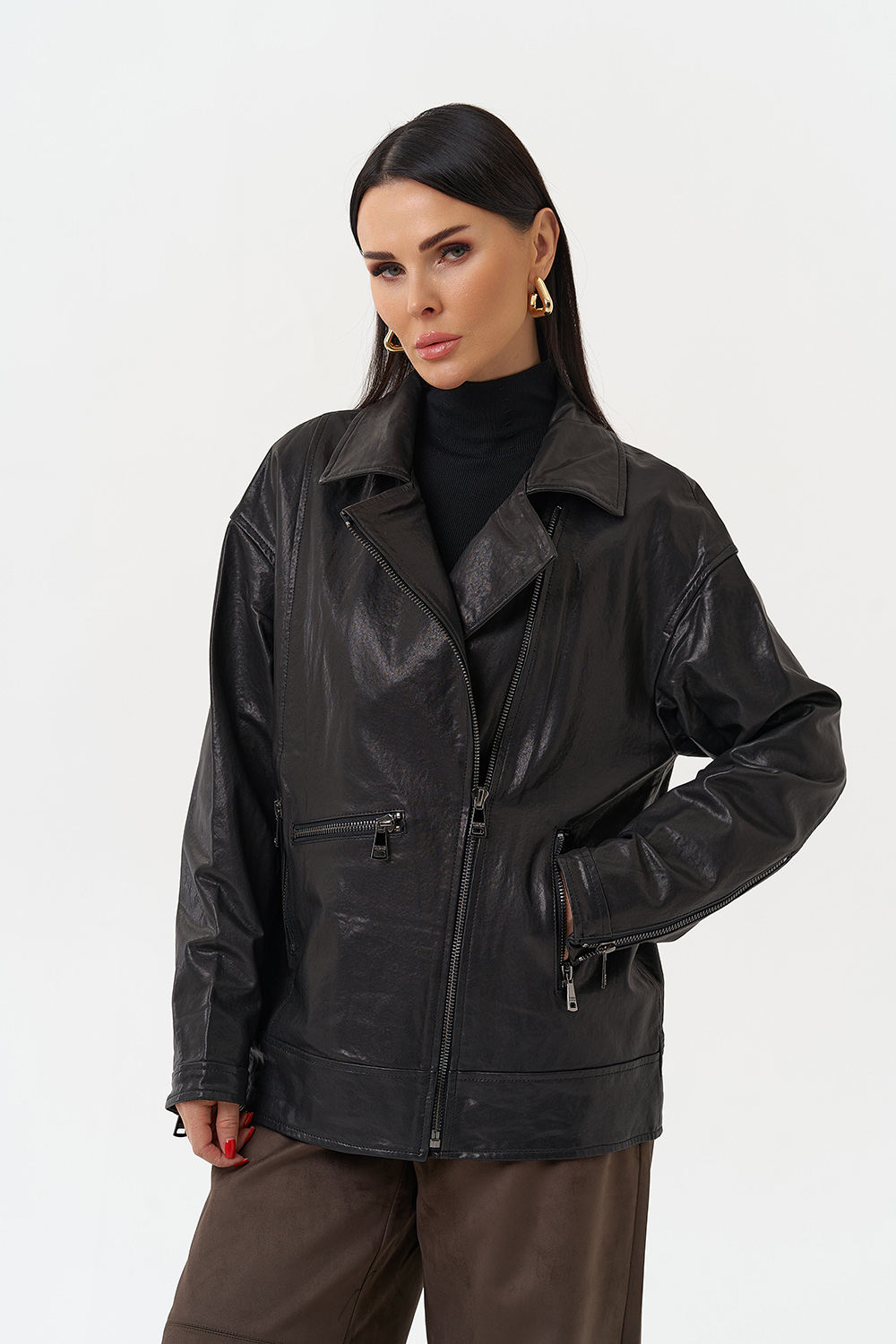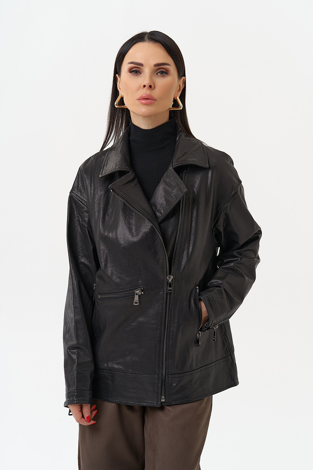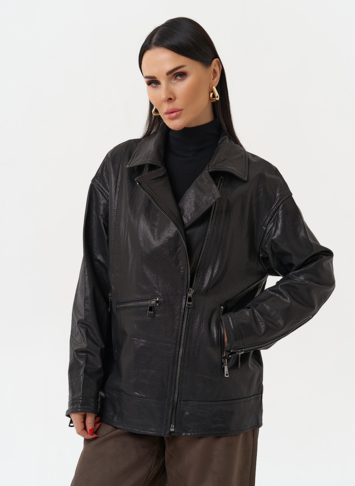 Женская косуха из натуральной кожи в черном цвете - универсальная модель, которая не сдает позиций с 1970-го года! В этом сезоне в трендовом оверсайз- фасоне. Он подойдет всем типам фигуры и будет хорошо смотреться с любым образом, а если вы хотите выделиться, то наденьте ее с легким платьем. Косуха дополнена отложным воротником и молнией. Если вы ищете куртку, которая будет вне времени и будет сочетается с любой одеждой, то это то, что вы искали.