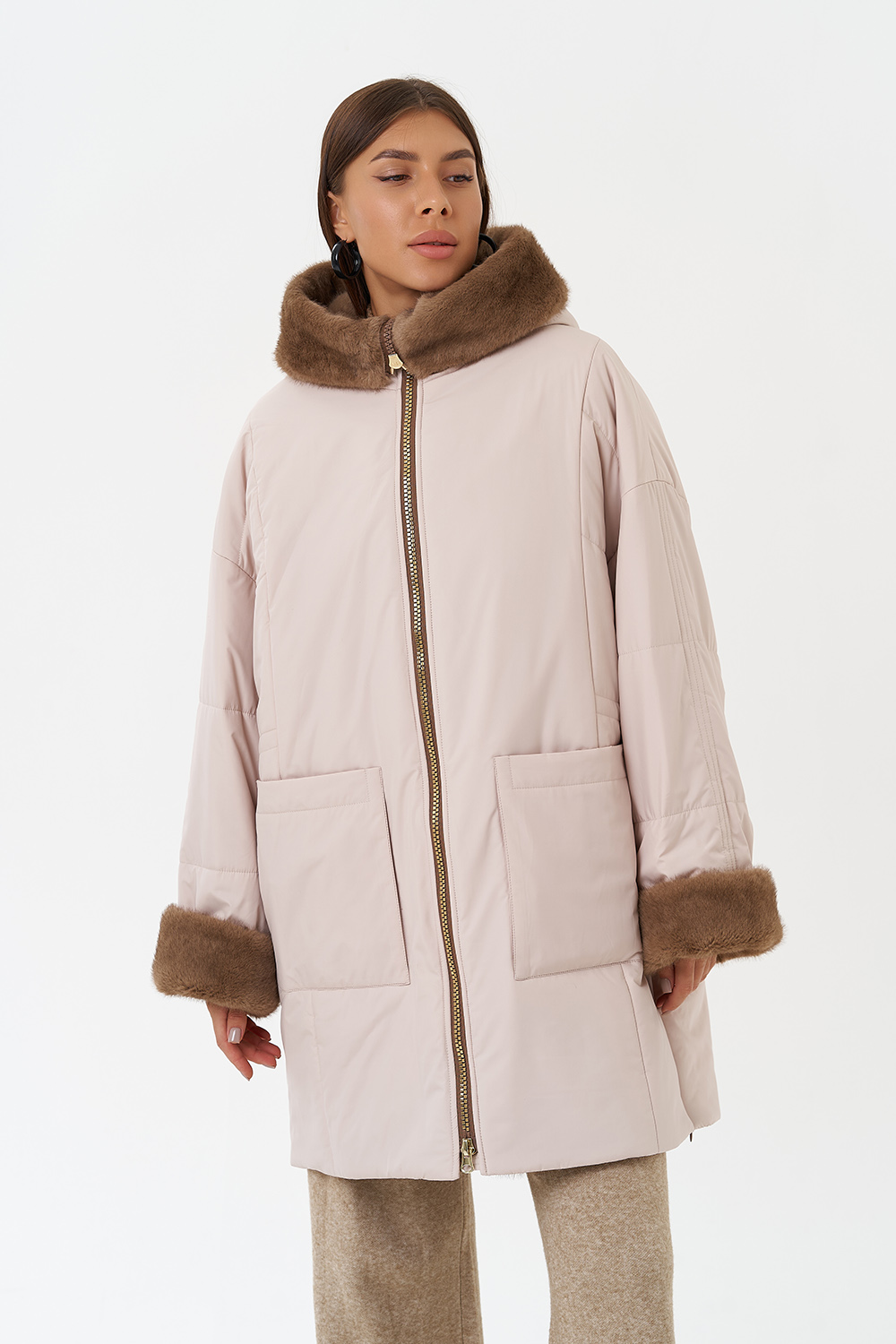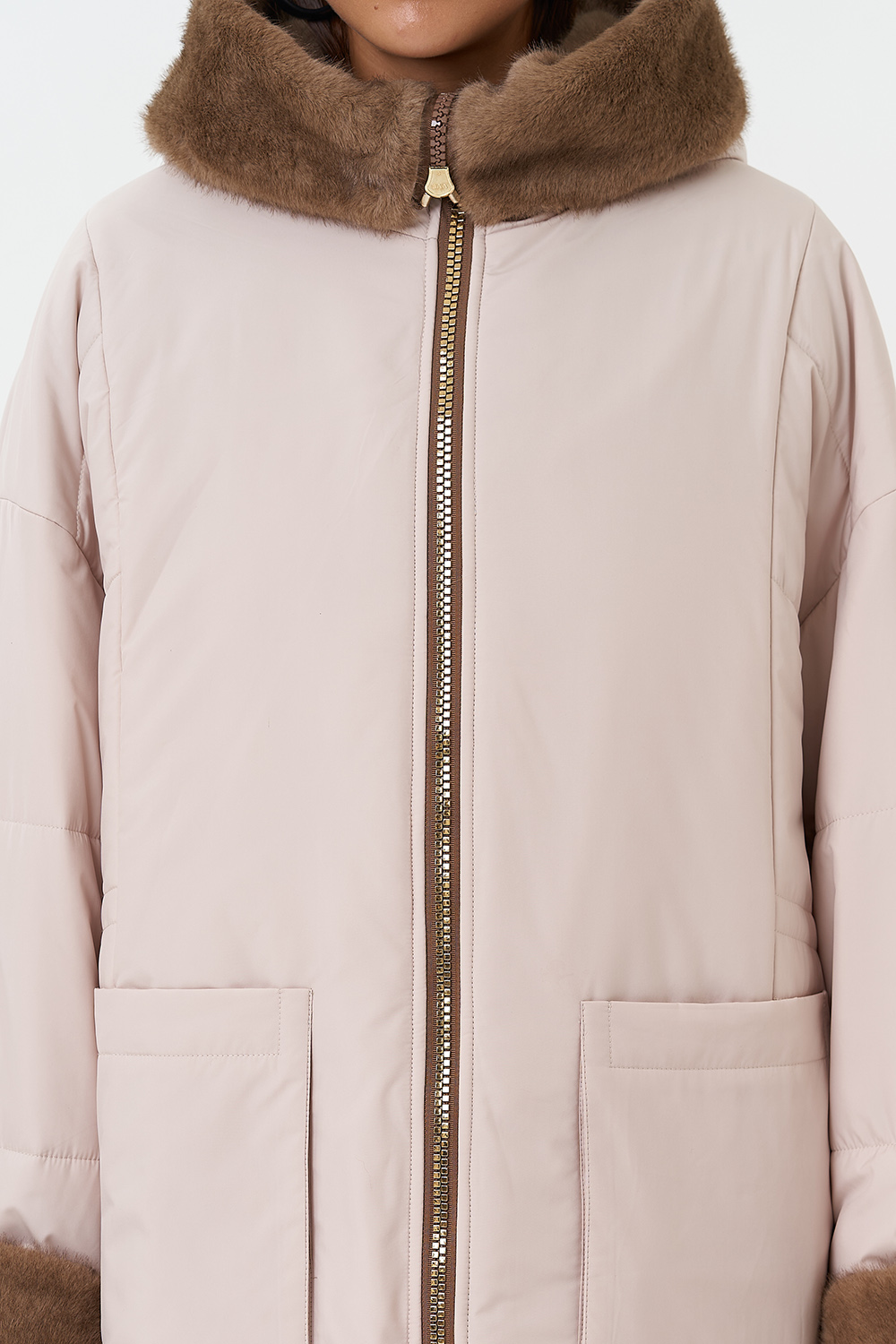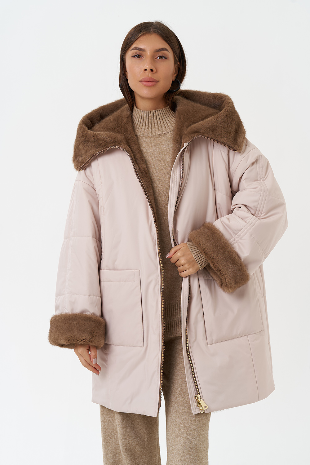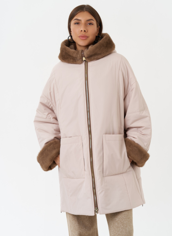 Крой воротника - капюшон, отделка эко мех под норку
